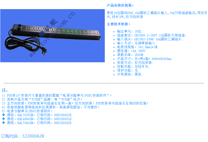 黑色18位国标PDU,16A国标三扁插头输入,10A万用插座输出,带总开关,线长3米,反方向安装