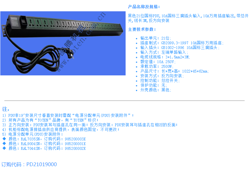黑色21位国标PDU,10A国标三扁插头输入,10A万用插座输出,带总开关,线长3M,反方向安装